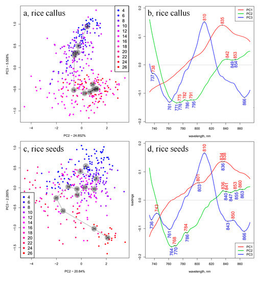 Hence, PCA evaluation was performed again in the spectral range 730 to 870 nm, on the smoothed and SNV- and linear detrend-corrected spectra. The PCA models of callus rice and rice seedlings samples show about 90% and 95% of the spectral variation in the first three principal components (PCs), respectively (Figure 3a,c). The score plot of the rice seedlings presents higher and more consistent variation, explained by the PC1, but PC2 and PC3 presented more prominent differences for callus rice and rice seedling samples; therefore, the data are not shown for PC1 scores, but they are presented in Figure 3a,c for PC2 and PC3.