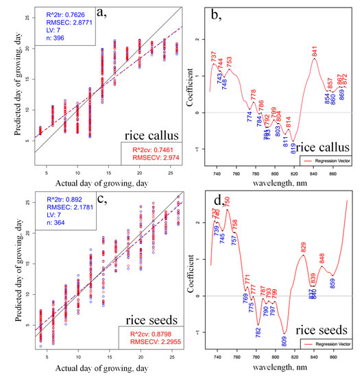 PLSR on the day of growing using the smoothed (calculated with Savitzky-Golay filter using 2nd order polynomial and 31 points), SNV- and linear detrend-corrected transmittance spectra in the spectral range between 730 and 870 nm of (a) 28 callus rice seeds and (c) 28 somatic rice seeds; regression vector of the PLSR models (b) for callus rice seeds and (d) for somatic rice seeds (blue circles indicate the calibration and red circles the cross-validation data points; blue dashed lines indicate the calibration Y-fit and red dashed lines the cross-validation Y-fit, while black continuous lines represent the Y-fit of ideal prediction).