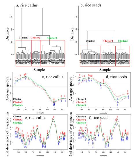 For each of the identified clusters, the average spectra and their second derivatives were calculated in order to explore the differences in the clusters found within the callus and rice seeds (Figure 5c–f). The average spectra showed subtle differences in the baseline for both callus and rice seeds, and the spectral region from 730 to 800 nm brought out differences between the clusters of biological replicates, which seemed especially different for rice seeds. To better extract the absorbance bands related to these differences, second derivative transformation canceled out the differences in the baseline and improved the resolution of the overlapped bands (Figure 5e,f).