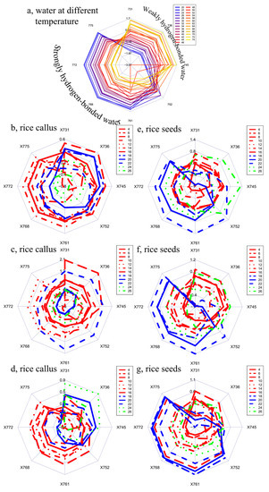 Next, the spectra of the three clusters were used separately to calculate aquagrams using the important wavelengths found in the third overtone region of water (720–780 nm) during the qualitative and quantitative evaluation of the spectral data, i.e., the evaluation of the raw and second derivative spectra, and PCA and PLSR evaluation (this region excludes the wavelengths that contained information about the physical differences or temperature). Thus, six aquagrams were calculated: three for the three callus rice clusters (Figure 6b–d) and three for the three rice seedlings clusters (Figure 6e–g), respectively. The aquagrams showed changes in water molecular structure during the observation period of cell development, represented by selected water absorbance bands.