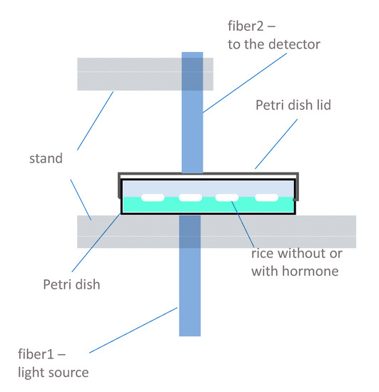 The fiber probes of the instrument were fixed with a stand with a gap equivalent to the height of the closed Petri dishes. The Petri dishes were placed on the stand and positioned for the individual seeds one by one for the measurement. During the monitoring period, scanning was repeated at the same positions marked on the first day of the experiment, which provided the spectra of the mixture of the original seed and the different developing organs after the germination, as well as for the late phase of seedling growth. The fiber transporting the light was attached from the bottom, while the fiber receiving the transmitted light through the sample was attached to the top of the Petri dishes (Figure 7). Every individual seed was scanned from four different directions, turning the Petri dish three times by 90°, and five consecutive scans were taken, resulting in 20 acquired spectra for each seed at a given time point. The total number of acquired sample spectra was 13,440 (2 types of samples (rice seedling growth and rice callus formation) × 28 seeds × 4 positions × 5 consecutive scans × 12 time points). The Petri dishes were kept closed during the entire experiment to avoid any contamination of the cultures.