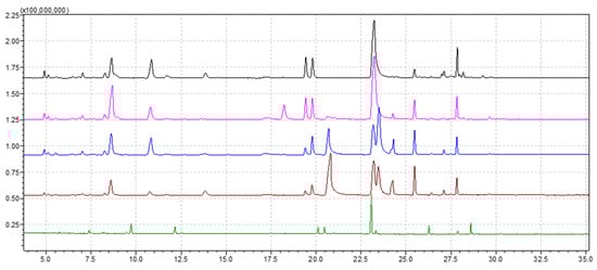 - Adams, R.P. Identification of Essential Oil Components by Gas Chromatography/Mass Spectrometry, 4th ed.; Allured Publishing Corporation: Carol Stream, IL, USA, 2007; ISBN 978-1-932633-21-4. [Google Scholar]