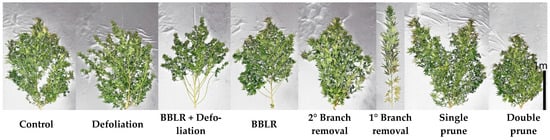 Effect of architecture-manipulation treatments on visual appearance of medical cannabis plants at chemical maturation. BBLR—Removal of leaves and branches from the bottom part of the plant; 1° Branch removal—removal of primary branches; 2° Branch removal—removal of secondary branches. The treatments are detailed in Section 3.2.