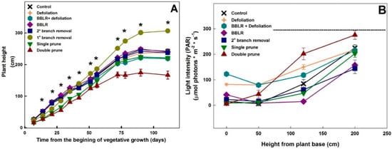 Effect of agricultural techniques that affect plant architecture on height of “drug-type” cannabis plants (A), and light intensity at different heights along the plants (B). Dashed line in B represents light levels at the greenhouse above the canopy. Data are averages ± SE (n = 6). Asterisks above the averages represent significant differences between treatments at a given measurement day, by the Tukey HSD test at α = 0.05.