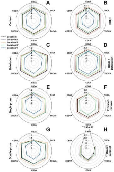 Relative concentrations of six cannabinoids at five locations along the plant, as affected by plant architecture-manipulation treatments: “Control” (A), “Defoliation” (B), “Defoliation + BBLR” (C), “BBLR” (D), “2° Branch removal” (E), “1° Branch removal” (F), “Single prune” (G), “Double prune” (H). Presented results for each cannabinoid are ratios relative to the concentration at the apical inflorescence on the main stem (location I) of the “Control” plants. CBGA levels in the “1° Branch removal” treatment were 3.45–4.55 (out of the scale of the unified spider charts). Data are means of six replicated plants per treatment (n = 6). “BBLR”—removal of leaves and branches from the bottom part of the plant. The treatments are detailed in Section 3.2.