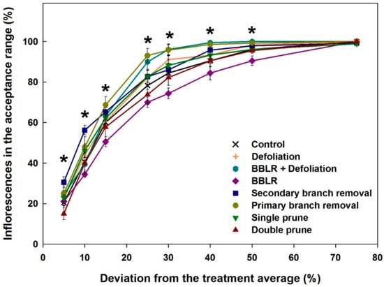 The results in Figure 3 reveal variability in concentrations of cannabinoids between locations in the plant in all treatments. To evaluate if the investigated treatments affected the extent of variability and have the potential for standardization of the chemical potential, we analyzed the effect of the treatments on uniformity of the chemical profile within the plant. A new score, “Plant Uniformity score” (PUS) that was recently developed by us [] was applied for the analysis. The “Plant Uniformity score” (PUS) integrates the variabilities of individual cannabinoids to generate an integrated plant uniformity value. This score allows to calculate the percentage of inflorescences in a treatment which their chemical profile deviates from the treatment average by a pre-defined percentage, for example, a deviation by more than ±5%, 15%, or 30% from the treatment average, etc. Figure 4 presents the plant uniformity score starting at a strict 5% deviation restriction, and up to an inclusive 75% deviation limit. High uniformity score is achieved by chemically similar inflorescences regardless of the treatment average concentration of each cannabinoid. The analysis revealed a few treatment-related effects: (i) All treatments except “Double prune” and “BBLR” improved chemical uniformity compared to the “Control”; (ii) BBLR was the least uniform treatment in the 10–50% range; (iii) in the strict 5–10% deviation range, "2° Branch removal” was the most uniform. but for the more accepting terms, “1° Branch removal” was more uniform; (iv) “BBLR + Defoliation” was the most uniform treatment (when excluding the branch removal treatments); (v) at all treatments, a “perfect score” (>95 uniformity) was achieved in the 50% deviation rate except for “BBLR”, which reached this goal only at the 75% level of deviation restriction. These results are similar to results reported by Danziger and Bernstein [] for smaller cannabis plants. In both studies, a perfect score was reached at the 50% restriction level by all treatments except for “1° Branch removal” and “2° Branch removal”, and a general increase in uniformity was achieved by most treatments compared to the “Control". This identified similarity between plants of different genetic background and size suggests that a maximum of 50% chemical variation from the average concentrations is a universal characteristic expected for cannabis plants regardless of their size. On the other hand, under a more restrictive levels of variance, the smaller plants grown by Danziger and Bernstein [] had a plant uniformity score higher by 5–15 points, demonstrating that a higher uniformity was achieved by cultivating smaller plants, though this should be tested under similar growing conditions and varieties.