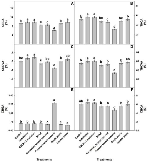 In general, the plant average concentrations of all cannabinoids except CBGA followed the trend of “Defoliation” = “BBLR + Defoliation” > “Double prune” > “Control” = “Single prune” > “BBLR” = “2° Branch removal” > “1° Branch removal”.