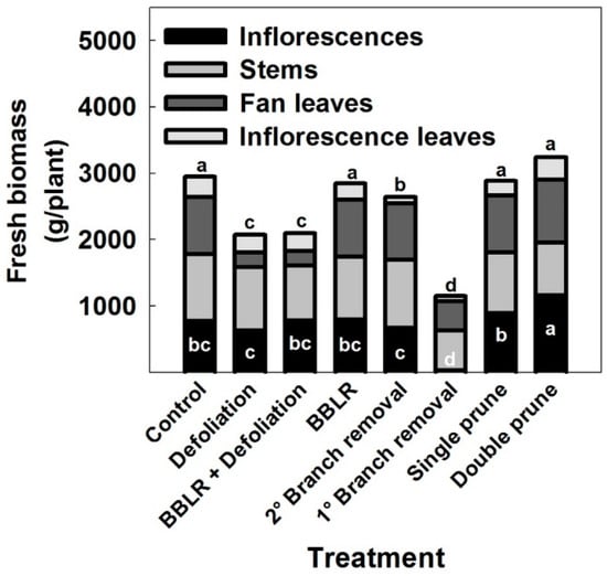 In many crops, shoot architectural manipulations induce not only morphological changes but also affect yield. In cannabis, yield could be described as either inflorescence biomass (per plant or cultivation area), or as cannabinoid production (per plant or cultivation area). In some industrial cannabis production schemes, vegetative plant biomass is also referred to as yield, as it can be utilized for example in the textile or construction industries []. Fresh biomass accumulation by different plant organs in the medical cannabis plants is presented in Figure 6. Inflorescence yield production per plant was affected by the treatments. Plants of the “Double prune” treatment produced higher yield (p < 0.05) than the “Control”, and the “1° Branch removal” plants had lower yield than the control (p < 0.05). All other treatments did not affect significantly yield biomes (Figure 6), demonstrating developmental plasticity of the reproductive growth in response to the invasive changes in shoot architecture.