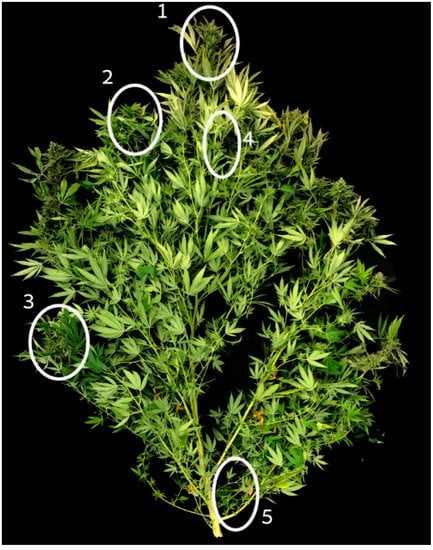 For the evaluation of the effect of the treatments on the standardization of the cannabinoid profile in the plant, inflorescences from 5 locations along the plants were analyzed for cannabinoid concentrations. The locations sampled (see Figure 7) were (1) the apical inflorescence on the main stem (for both pruning treatments, the top-most apical inflorescence on the plant was sampled); (2) apical inflorescence from a 1° branch, from the top 1/3 of the plant (the 4th branch from the plant top; for the double-prune treatment, the top most inflorescence of the 2nd or 3rd branch from the top was sampled); (3) apical inflorescence of a 1° branch from the bottom 1/3 of the plant (4th branch from the plant base; for the double-prune treatment, the top most inflorescence of the branch was sampled); (4) inflorescence close to the stem from an upper branch (2nd branch from the top of the plant); and (5) inflorescence close to the stem from the bottom of the plant—the smallest and least developed inflorescences were sampled (from the 1st branch from the plant base; the 2° Branch removal treatment was not sampled for this location). For the “1° Branch removal” treatment, which developed a single inflorescence at the top of the plant, we evaluated spatial standardization within the inflorescent by sampling four locations: 1—top of the inflorescence; 2 and 3: middle sections from two opposite sides of the inflorescence; and 4—the bottom part of the inflorescence. Trimmed inflorescences were dried at 24 °C and 55% air humidity for 14 days, in an environmentally controlled chamber, in the dark. The analyses were conducted for 6 replicated plants per treatment, for one inflorescence per location per plant, following the experimental design.