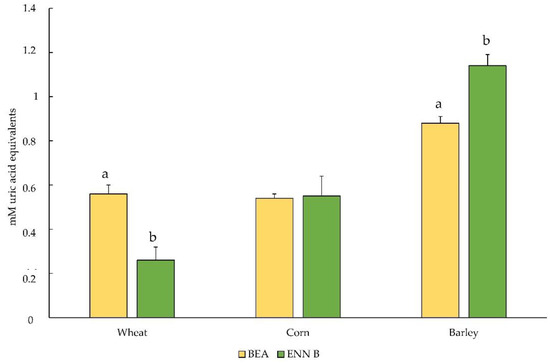Serra, V.; Salvatori, G.; Pastorelli, G. Pilot Study: Does Contamination with Enniatin B and Beauvericin Affect the Antioxidant Capacity of Cereals Commonly Used in Animal Feeding? Plants 2021, 10, 1835. https://doi.org/10.3390/plants10091835