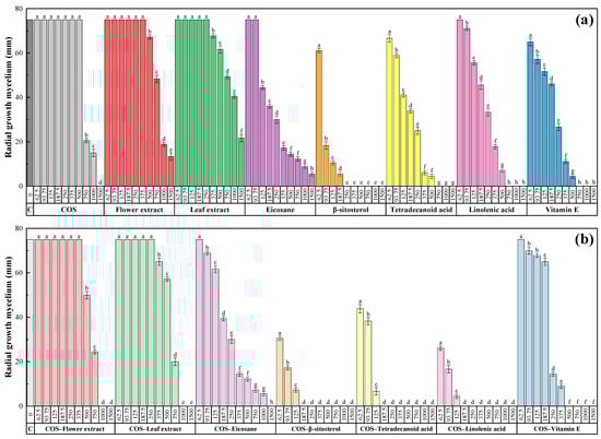 Radial growth of the mycelium for D. seriata in in vitro tests conducted in PDA medium with different concentrations (62.5, 93.75, 125, 187.5, 250, 375, 500, 750, 1000 and 1500 µg·mL−1) of chitosan oligomers (COS), L. binervosum flower and leaf extracts, and their main phytochemical constituents (a), and their respective conjugate complexes (b). The same letters above concentrations mean that they are not significantly different at p < 0.05. Error bars represent standard deviations.