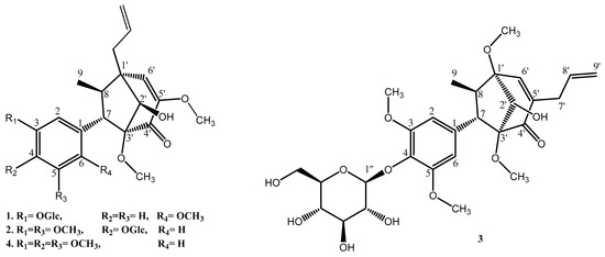 In this study, four bicyclo[3.2.1]octanoid neolignans were isolated from the MeOH extract of P. crocatum leaves. Their structures were identified as pipcroside A (1), pipcroside B (2), pipcroside C (3), and crocatin B (4) [3]. Their structures were elucidated by one- and two-dimensional NMR and mass spectrometries (Figure 1) (see Supplementary Materials).