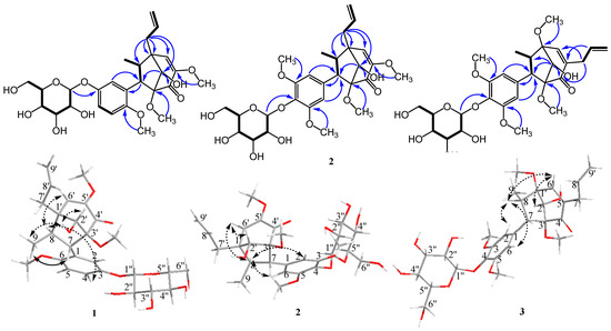 Compound 1 was isolated as a white amorphous powder. Its molecular formula was established as C27H36O11 using HR-ESI-MS. The 1H NMR spectrum (Table 1) showed the presence of an ABX system of aromatic protons at δH 6.47 (t, J = 2.0 Hz, H-2), 6.48 (dd, J = 8.0, 2.0 Hz, H-4), and 6.87 (d, J = 8.0 Hz, H-5), as well as an allyl group suggested from the COSY spectrum at δH 2.30 (dd, J = 13.7, 7.0 Hz, H-7′a), 2.63 (dd, J = 13.7, 7.0 Hz, H-7′b), 5.14 (td, J = 10.0 Hz, H-9′a), 5.27 (d, J = 17.0 Hz, H-9′b), and 5.93 (td, J = 17.0, 7.0 Hz, H-8′), and 3.24 (m, H-7)/2.13 (p, J = 7.0 Hz, H-8), and a signal assigned to the anomeric proton of the glucosyl moiety at δH 4.84 (d, J = 7.2 Hz, H-1″). Other proton signals suggested three methoxyl groups at δH 3.16 (s, 3′-OMe), 3.56 (s, 5′-OMe), and 3.64 (s, 6-OMe), as well as a methyl group attached to the aliphatic carbon at δH 1.15 (d, J = 7.0 Hz, H-9). The 13C NMR spectrum indicated the presence of six aromatic carbons at δC 112.4 (C-2), 114.3 (C-5), 121.4 (C-4), 132.4 (C-1), 145.2 (C-3), and 148.0 (C-6) and a glucosyl moiety at δC 60.4 (C-6″), 69.5 (C-4″), 73.1 (C-2″), 76.8 (C-3″), 76.9 (C-5″), and 99.6 (C-1″). Other signals, such as a carbinol carbon at δC 78.1 (C-2′); an allyl group at δC 34.1 (C-7′), 118.0 (C-9′), and 135.3 (C-8′); olefinic carbons at δC 126.6 (C-6′) and 151.6 (C-5′); two quaternary carbons at δC 48.6 (C-1′) and 96.1 (C-3′); and a carbonyl group at δC 192.4 (C-4′), indicated a bicyclo[3.2.1]octane derivative, which was similar to compound 4. Therefore, both 1H and 13C NMR spectra demonstrated that compound 1 was a bicyclo[3.2.1]octane lignan derivative. The connection between aromatic ring, glycosyl group, and bicyclo[3.2.1]octane of compound 1 was unambiguously assigned based on HMBC spectra (Figure 2). Key HMBC correlations between H-2′ (δH 3.81)/C-4′ (δC 192.4) and C-7 (δC 57.9) indicate the connection between the C3-bicyclooctane moiety at C-3′. Similarly, H-7′ (δH 2.30 and 2.63)/C-1′ (δC 48.6), C-2′ (δC 78.1), C-6′ (δC 126.6), and C-8 (δC 47.8) further supported the presence of the C3-bicyclooctane moiety at C-1′ (δC 48.6) and the assigned position of an allyl group at C-1′. The correlation between H-1″ (δH 4.84) and 145.2 (C-3) indicated that the glycosyl group was attached at C-7 of the aromatic ring. These data led to the identification of a guianin-type 7.1′,8.3′-connected neolignan skeleton of compound 1.