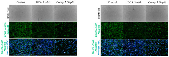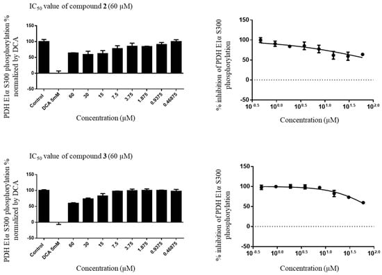 PDH is essential in the pathway of glucose metabolism and ATP production. Suppression of PDH reduces the aerobic oxidation of pyruvate and promotes its transformation to lactate in cytoplasm. Additionally, decreased flux of pyruvate via PDH diminishes the amount of acetyl-CoA entering into the TCA cycle. Accordingly, defects in both PDH and oxidative phosphorylation activities result in lactic acidosis and initiation of the Warburg effect [7]. The activity of PDH is mainly controlled by reversible phosphorylation of the E1α subunit on residue sites serine 293 (Site 1), 300 (Site 2), and 232 (Site 3), which are mediated by PDK and pyruvate dehydrogenase phosphatase (PDP) phosphorylation of E1α by PDKs, which inactivates PDH, whereas PDP exhibits active/reactive catalytic activity by dephosphorylating the complex [15]. Compounds 2 and 3 were evaluated for their inhibitory effect against PDHE1α S300 phosphorylation; we discuss the phosphorylation inhibitory effect of the E1α subunit on residue site serine 300 (Site 2). Fluorescent image results suggested that compounds 2 and 3 inhibited phosphorylation of E1α S300 at 60 µM with better effect than that of dichloroacetate (DCA) at 5 mM concentration; compound 2 showed the strongest effect among all three compounds (Figure 3).
