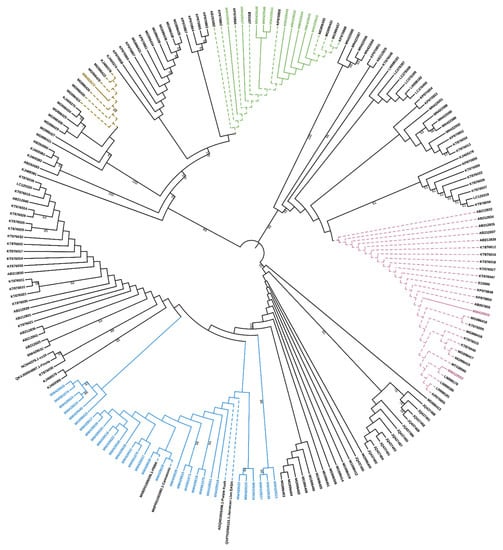 https://www.ebi.ac.uk/Tools/msa/muscle/ accessed on 8 March 2021). For phylogenetic analysis the evolutionary history was inferred using the Neighbor-Joining method in the MEGA-X software [