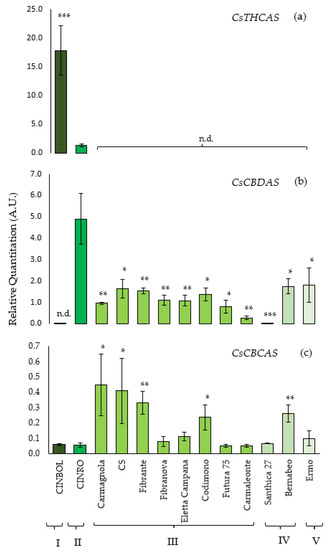 In the present work, several fiber- and drug-type genotypes were investigated for the presence of CBCAS sequences, assessing sequence variability and transcriptional levels. Markers were also developed to distinguish these sequences from the THCAS and CBDAS ones.