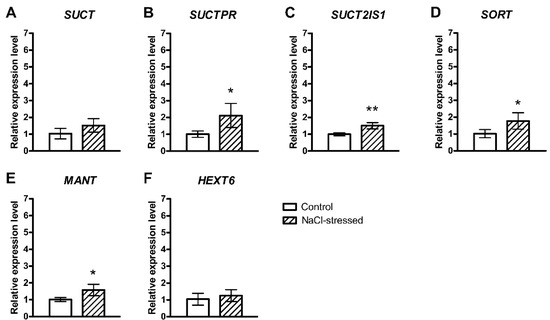 Relative expression of genes encoding carbohydrate transporters in the pulp of F. carica (cv. Dottato) fruits harvested from 100 mM NaCl-stressed plants after 48 days. The values were determined with RT-qPCR. (A) Sucrose Transporter (SUCT); (B) Sucrose Transporter 4-Like (SUCTPR); (C) Sucrose Transporter 2 Isoform 1 (SUCT2IS1); (D) Sorbitol Transporter (SORT); (E) Probable Mannitol Transporter (MANT); (F) Hexose Transporter 6-Like (HEXT6). Fold change values are means ± SD of three biological replicates. Asterisks indicate statistically significant differences (* p ≤ 0.05, ** p ≤ 0.01).