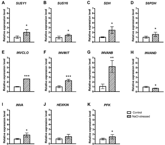Relative expression of genes encoding carbohydrate metabolism in the pulp of F. carica (cv. Dottato) fruits harvested from 100 mM NaCl-stressed plants after 48 days. The values were determined with RT-qPCR. (A) Sucrose Synthases 1 (SUSY1); (B) Sucrose Synthases 6 (SUSY6); (C) Sorbitol Dehydrogenase (SDH); (D) NADP-dependent D-sorbitol 6-phosphate Dehydrogenase (S6PDH); (E) Alkaline-neutral Invertase-Like Chloroplastic (INVCLO); (F) Alkaline-neutral Invertase-Like Mitochondrial (INVMIT); (G) Alkaline-neutral Invertase B (INVANB); (H) Probable Alkaline-neutral Invertase D (INVAND); (I) Acid β-fructofuranosidase (INVA); (J) Hexokinase-1 (HEXKIN); (K) ATP-dependent-6-phosphofructokinase 3 (PFK). Fold change values are means ± SD of three biological replicates. Asterisks indicate statistically significant differences (* p ≤ 0.05, ** p ≤ 0.01, *** p ≤ 0.001).