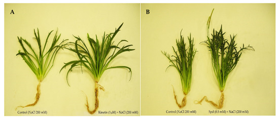 Previous works by our research group showed that P. coronopus seeds collected from Brujuelo saltmarsh in Jaén (Spain) and cultivated hydroponically showed similar dry weight at 0 and 100 mM NaCl and a decrease at 200 mM NaCl (whole plant) [32]. We decided to choose 0 mM and 200 mM NaCl for the cultivation of this halophyte. Growth parameters such as dry weight and water content, at 45 days old, are shown in Table 1. In non-saline conditions, a positive effect on stem + leaves dry weight (SLDW) and root dry weight (RDW) was observed; being pretreatments Spd and SA (p ≤ 0.05) whose having the highest values, above all in RDW (A in Table 1). In the case of Spd, the increases in SLDW and RDW were 47% and 86%, respectively. In water content Spd and SA also had the highest values of all studied pretreatments, especially in roots (increase of 9% compared to control). In saline pretreatments (B in Table 1), Kinetin + salt and Spd + salt obtained the best results for SLDW, while IAA + salt and Spd + salt had the best values for RDW. In the pretreatment Spd + salt the increases were 174% and 197% for SLDW and RDW, respectively, compared to the controls (salt). Growth with the treatments Kinetin + salt and Spd + salt are shown in Figure 1.