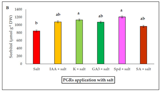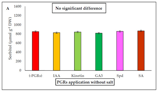 The benefits that PGRs application have on growth and abiotic stress are well known [42,43,44]. Under saline conditions, PGRs alleviate the adverse effects of salt on morphological, physiological, biochemical characteristics, and on crop yields and quality [10,29,45].