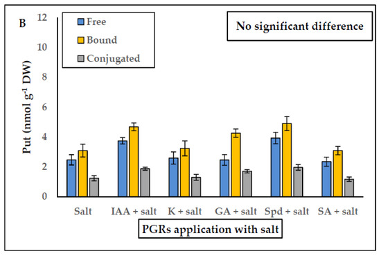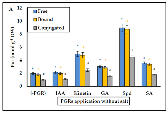 (A) Effect of PGRs application without salt, and (B) PGRs with salt (200 mM NaCl), in Plantago coronopus leaves at 45-day-old, on Putrescine (Free, Bound and Conjugated) content. Means ± SE (n = 3). The asterisk above the column represents significant difference between treatments of free Put, significant difference between treatments of bound Put and significant difference between treatments of conjugated Put, according to Tukey’s test (p ≤ 0.01).