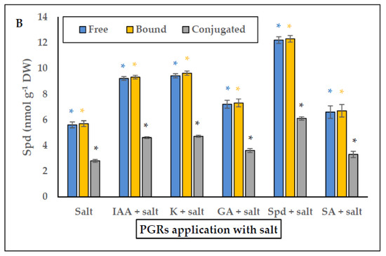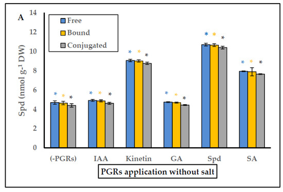 (A) Effect of PGRs application without salt, and (B) PGRs with salt (200 mM NaCl), in Plantago coronopus leaves at 45-day-old, on Spermidine (Free, Bound and Conjugated) content. Means ± SE (n = 3). The asterisk above the column represents significant difference between treatment of free Spd, significant difference between treatments of bound Spd and significant difference between treatments of conjugated Spd, according to Tukey’s test (p ≤ 0.01).