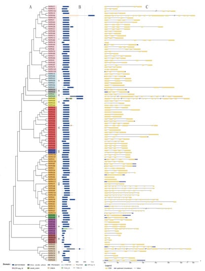 Phylogenetic relation, domain, and gene structure of PbPRX gene family. (A) Phylogenetic tree of the PbPRX gene family. (B) Domain information of members of PbPRX gene family; (C) Exon–intron structure of pear PRX genes. Yellow boxes indicate exons; lines indicate introns; blue boxes indicate the upstream or downstream.
