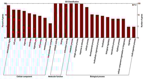 In this study, a total of 109 differentially expressed genes that could be categorized into 25 functional groups were found (Figure 3). The major subcategories were as follows: one for cellular component (‘extracellular region’); three for molecular function (‘catalytic activity’, ‘binding’, and ‘antioxidant activity’); and three for biological process (‘metabolic process’, ‘single-organism process’, and ‘response to stimulus’). These results indicate that PbPRX genes are mainly functioning in ‘catalytic activity’, ‘binding’, ‘metabolic process’.