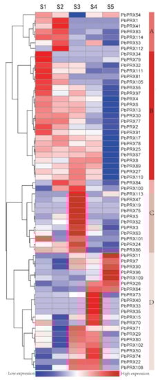 Heat map representation of PbPRX genes the five stages of pear fruit development. S1 22 Apr, 15 days after full bloom (DAFB); S2 13 May, 36DAFB; S3 27 June, 81DAFB; S4 28 July 110DAFB; S5 30 Aug, 145DAFB. A B C D on the right means different branches.