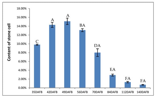 To investigate the formation of stone cells, we determined the content of stone cells from early fruit set to maturity. We found that the content of stone cells reached a maximum at 49 DAFB, and after that, the stone cells number was reduced. The content of stone cells was at a minimum when the fruit was mature (Figure 5).
