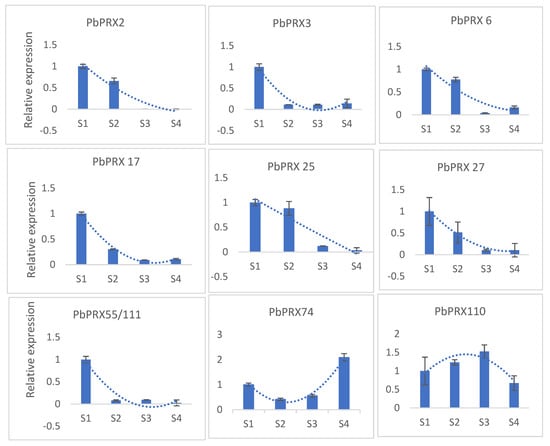 Expression levels of some particular PbPRX gene of “Dangshansu” pear fruit S1:15 days after full bloom (DAFB); S2:36DAFB; S3:79DAFB; S4:107DAFB.