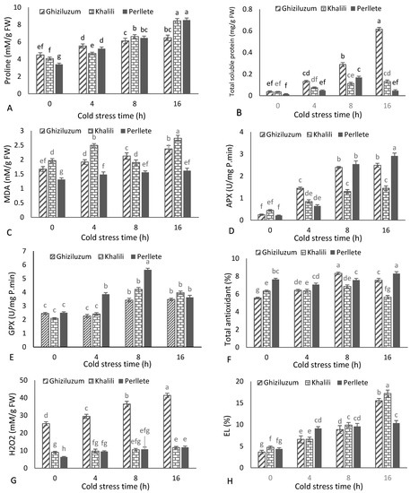 The effects of cold stress time-course on the proline content (A), total soluble protein (B), malondialdehyde (MDA) (C), ascorbate peroxidase (APX) (D), guaiacol peroxidase (GPX) (E), total antioxidants (F), H2O2 (G) and electrolyte leakage (EL) (H) of three grapevine cultivars. Similar letters show no meaningful difference at 5% probability level by Duncan’s Multiple Range Test. Data are mean ± SD (n = 3).