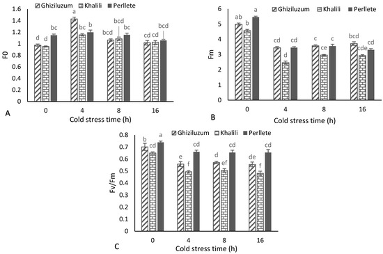 The effects of cold stress time-course on F0 (minimal fluorescence) (A), Fm (maximal fluorescence) (B) and Fv/Fm (maximum photochemical quantum yield of photosystem II) (C) of three grapevine cultivars. Similar letters show no meaningful difference at 5% probability level by Duncan’s Multiple Range Test. Data are mean ± SD (n = 3).