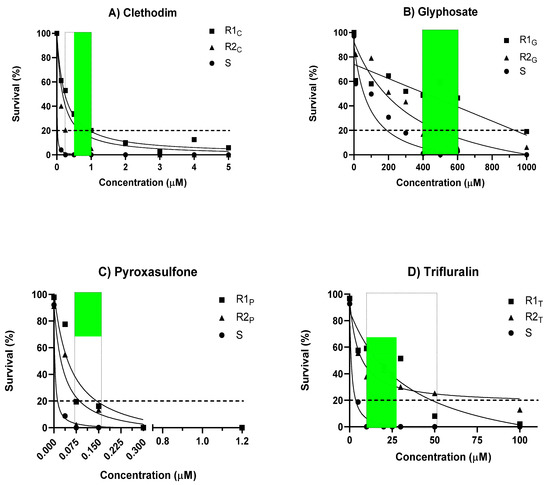 Dose-response curves (see text for regression equation) for seedlings of susceptible (S) and resistant (R) populations of Lolium rigidum germinated on agar containing increasing concentrations of (A) clethodim; (B) glyphosate; (C) pyroxasulfone; or (D) trifluralin (each data point is the average of two experimental runs with three replicates per concentration; the dotted line represents a discriminating threshold to identify a highly resistant population (>20% survival) while the shaded area defines the range of concentrations that could be used to detect herbicide-resistant phenotypes (0% survival of S vs. 2%–60% survival of R).