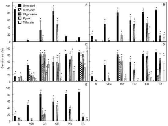 Apparent resistance levels (means ± SE, measured as the percentage of seeds germinating after 7 d and producing a coleoptile of ≥4 cm) of population S, non-dormant susceptible control; VD4, dormant susceptible control; CR, clethodim-resistant; GR, glyphosate-resistant; PR, pyroxasulfone-resistant; TR, trifluralin-resistant when placed on herbicide-containing (or untreated) agar under germination conditions of 25/15 °C with a 12 h photoperiod: (A) direct imbibition; (B) 21 d dark stratification in the absence of herbicides; (C–E) 21 d dark stratification on 0.1×, 0.25×, and 1× of the herbicide discriminating dose, respectively (2 μM clethodim, 400 μM glyphosate, 0.15 μM pyroxasulfone, or 20 μM trifluralin); herbicide treatments resulting in ≥20% germination (p < 0.05), indicating apparent resistance, are marked with an asterisk.