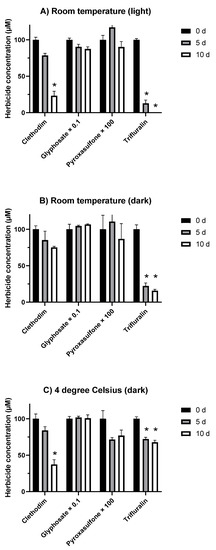Stability of herbicides in agar (herbicides incorporated at concentrations of 2 μM clethodim, 400 μM glyphosate, 0.15 μM pyroxasulfone, or 20 μM trifluralin) stored at (A) room temperature under ambient light; (B) room temperature in the dark; or (C) 4 °C in the dark and monitored at 0, 5, and 10 d after the start of the experiment (values are means ± SE; asterisks (*) above bars denote herbicide doses that are significantly (p < 0.05) different from the corresponding starting concentration (0 d).