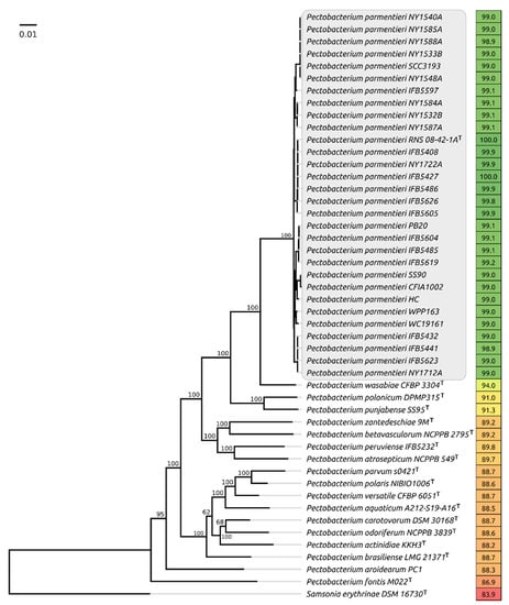 Phylogenetic tree based on the concatenated nucleotide sequences of 92 conservative genes, including the genes of ribosomal proteins and the proteins essential for the transcription and translation processes. Bootstrap support values are shown above their branch as a percentage of 1000 replicates. The scale bar shows 0.01 estimated substitutions per site, and the tree was rooted to Samsonia erythrinae DSM 16730. Average nucleotide identity (ANI) values compared to P. parmentieri RNA 08-42-1A type strain are shown to the right of the organism name and coloured according to a heat map scale, where a green colour corresponds to the highest value and a red colour corresponds to the lowest value.