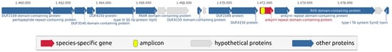 Region in the P. parmentieri RNS 08-42-1AT genome containing a species-specific sequence. The scheme was visualised using Geneious Prime 2021.2.2 (https://www.geneious.com, accessed on 20 January 2021).