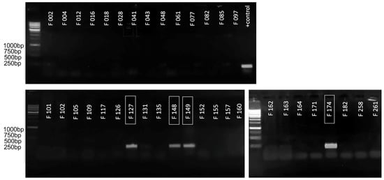 The results of conventional PCR visualised in 1.5% agarose gel. The numbers of the strains belonging to Ppa are marked with a frame. The remaining strains belonging to other species acted as negative controls. The lane designated as “+ control” contained PCR results with test plasmid, which served as a positive control. Evrogen 1 kb Ladder used for the evaluation of amplicons sizes.