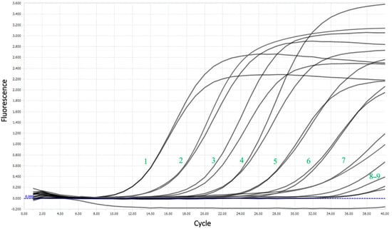The limit of detection (LoD) was nearly 16 copies per reaction, corresponding to 4 × 102 copies/mL. Figure 5 shows the amplification curves for the sensitivity test and the good flare-up of the probe during the reaction, even at high dilutions.
