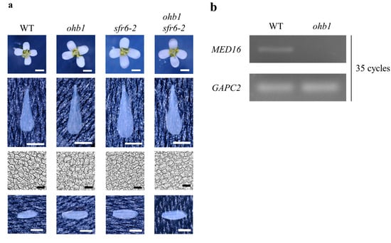 Characteristics of ohb1 mutant. (a) Flower phenotypes of the WT, ohb1, sfr6-2, and ohb1 sfr6-2 plants. The whole flowers, petals, petal abaxial epidermal cells, and sepals in each line are shown. White and black bars represent 1 mm and 20 μm, respectively. (b) RT-PCR analysis of MED16 expression in WT and ohb1. The transcript amount of GCP2 was used as an internal control in the RT-PCR.