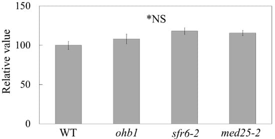 The Ar50-46-pl1 mutant line was screened from a mutant library induced by Ar-ion beam irradiation at the RIKEN Nishina Center [,]. It had a large flower phenotype (Figure 1a) and was named ohbana1 (ohb1), meaning “Large flower” in Japanese. A whole-genome mutation analysis was performed to detect candidate genes responsible for the large flower phenotype. In the M3 generation, five homogenous mutations in three loci, which had been predicted to affect gene function, were detected in the mutant genome (Table 1). Therefore, three mutated genes were candidates responsible for the mutant phenotype. In linkage analyses after backcrossing, a total of 23 plants out of 126 plants showed a large flower phenotype and homozygous mutations in AT4G04920 (Table S1), which was previously characterized as MED16 [,]. Reverse transcription PCR (RT-PCR) analysis was applied to confirm the gene expression of MED16 in ohb1. The expression of MED16 was barely detected in ohb1 (Figure 1b). These results indicated that the recessive mutated gene in AT4G04920 could be responsible for the large flower phenotype and that ohb1 is a null mutant of MED16.
