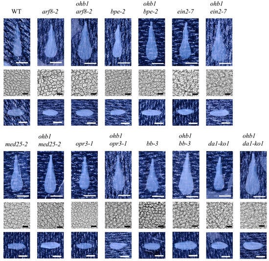 A total of five mutant lines: arf8-2 [], bpe-2 [], ein2-7 [], med25-2, and opr3-1 [], which are large flower mutants associated with post-mitotic cell expansion, were used to construct double-mutant lines by crossing them with ohb1. The floral organ phenotypes for each single mutant showed similar characteristics to those reported in previous studies (Figure 3, Table 2) [,,,,]. A double mutant, ohb1 arf8-2, formed larger petals and sepals than each single mutant (Figure 3). The cell size of the petals in the double mutant was almost the same as that in ohb1 (Table 2). In addition, the fruits produced by the double mutant were smaller than those produced by each single mutant (Figure 4), and the fruit length in the double mutant was reduced to approximately 38% of that in WT. The ohb1 bpe-2, ohb1 ein2-7, and ohb1 opr3-1 flowers had larger petals and sepals compared to each single mutant (Figure 3). The ohb1 med25-2 mutant plants had larger floral organs than ohb1 (Table 2). However, none of the increasing rates in the ohb1 med25-2 floral organs were significantly higher than those in the med25-2 organs (Table 2).
