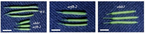 Fruits produced by the mutant lines related to ohb1 and arf8. Bars represent 3 mm.