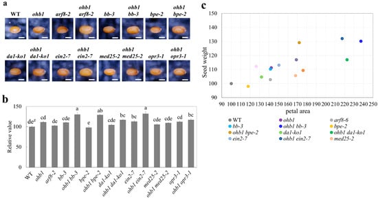 The seed weights for each large flower mutant line were measured and compared. The seeds produced by the large flower mutants tended to be larger and heavier than the WT seeds (Figure 5a,b). The ein2-7 single mutant produced the heaviest seeds among the single mutants (Figure 5b). The ohb1 bb-3, ohb1 bpe-2, and ohb1 ein2-7 seed weights were enhanced by double mutant formation because the ohb1 bb-3, ohb1 bpe-2, and ohb1 ein2-7 seed weights were significantly heavier than those produced by each single mutant. The ohb1 med25-2 seed sizes and weights were almost the same as the single mutant weights and sizes. It was impossible to collect a sufficient number of seeds from ohb1 arf8-2 to carry out a seed weight analysis due to the low fertility levels exhibited by this mutant (data not shown). A positive correlation (r = 0.795) was observed between the petal area and the seed weight (Figure 5c).