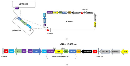 The pGEF-U vector includes expression cassettes for GFP, Cas9, and up to four independent gRNAs. The GFP expression cassette was first built by CaMV 35S promoter PCR amplification using the primers attB1-CaMV35Sx2/attB2-CaMV35Sx2 (Supplementary Table S4) and the pGWB402 vector as a template (Addgene plasmid #74796). PCR reactions consisted of 5 µL attB1-CaMV35Sx2/attB2-CaMV35Sx2 primers mix (10 μM), 10 µL 5× SuperFi Buffer (Thermo Fisher Scientific, Waltham, MA, USA), 1 µL dNTPs (10 mM), 1 µL pGWB402 vector (10 ng/µL; Addgene Plasmid #74796), 0.5 µL Platinum SuperFi DNA Polymerase (Thermo Fisher Scientific), and 32.5 µL nuclease-free water, resulting in a final volume of 50 µL. PCR conditions were: initial denaturation 98 °C (30 s), 40 cycles (98 °C (10 s), 58 °C (10 s), 72 °C (45 s)) and final extension of 72 °C (10 min). The amplicon was recombined into the pDONR207 donor vector (Thermo Fisher Scientific) following the manufacturer’s indications and the recombination mix used in the transformation of One Shot® TOP10 (Thermo Fisher Scientific) chemically competent E. coli cells. Recombined pDONR207-CaMV35Sx2 plasmid was used in a new recombination reaction with the pGWB504 (Addgene plasmid #74846), and this recombination mix was used in One Shot® TOP10 transformation. Recombined pGWB504-CaMV35Sx2 expression clone was confirmed by sequencing (Macrogen Inc., Seoul, Korea). From this latter construct, the expression cassette consisting of CaMV35S-GFP-tNOS was amplified and isolated using the GWcst-Fw/GWcst-Rv primer pair (Supplementary Table S4). The amplification conditions were as above. PCR reactions consisted of 5 µL GWcst-Fw/GWcst-Rv primers mix (10 μM), 10 µL 5× SuperFi Buffer, 1 µL dNTPs (10 mM), 1 µL pGWB504-CaMV35Sx2 vector (10 ng/µL), 0.5 µL Platinum SuperFi DNA Polymerase, and 32.5 µL nuclease-free water, resulting in a final volume of 50 µL. PCR conditions were: initial denaturation 98 °C (30 s), 40 cycles (98 °C (10 s), 58 °C (10 s), 72 °C (45 s)) and final extension of 72 °C (10 min). The PCR product was electrophoresed and purified from ethidium bromide-stained 1.2% agarose gels with the ZymoClean Gel Recovery kit (Zymo Research, Irvine, CA, USA), eluted with 6 µL nuclease-free water and used for cloning into a previously built linearized LSL-type vector, pGMV-U (Addgene #112797; Supplementary Figure S8) [22]. pGMV-U was linearized with the AscI (SgsI) FastDigest (Thermo Fisher Scientific) and dephosphorylated using the Quick Dephosphorylation Kit (New England Biolabs, Ipswich, MA, USA). Ligation of the linearized vector and the GFP expression cassette was carried out using T4 DNA Ligase (New England Biolabs). All these steps were carried out according to the respective manufacturers’ instructions. The ligation mix was used to transform One Shot® Top 10 E. coli chemically competent cells and selected on 100 mg/L kanamycin LB agar plates, following the manufacturer’s instructions. Clones were checked by colony PCR, using Kapa Taq DNA Polymerase (Kapa Biosystems, Wilmington, MA, USA) according to the manufacturer’s specifications. To verify the cassette insertion within the AscI restriction site, we used the primers pair AscI-Upstream/AscI-Downstream described in Supplementary Table S4. The determination of the direction of the insertion was verified by sequencing (Macrogen Inc.).
