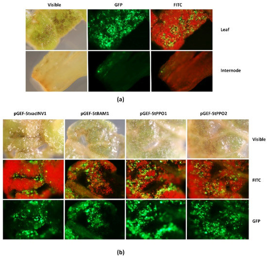 Functionality of pGEF-U in Agrobacterium-mediated transformation of ‘Yagana-INIA’ explants. Transient expression of pGEF-U was followed by GFP epifluorescence analyses at 7 days post-inoculation in leaf and internode sections of ‘Yagana-INIA’ (a). Once functionality was verified, dedicated vectors targeting specific target genes associated with cold induced sweetening (pGEF-StvacINV1 and pGEF-StBAM1) and polyphenoloxydase enzymatic browning (pGEF-StPPO1 and pGEF-StPPO2) were assembled and evaluated by leaf agroinfiltration and evaluated at this same dpi (b). Visible, field observation of the explants using white light; FITC, field observation applying the fluorescein-5-isothiocyanate filter under epifluorescence excitation; GFP, field observation applying the green fluorescent protein specific filter under epifluorescence excitation. Images were acquired under 50× amplification using an Axioscope Lab A.1 (Zeiss) system.