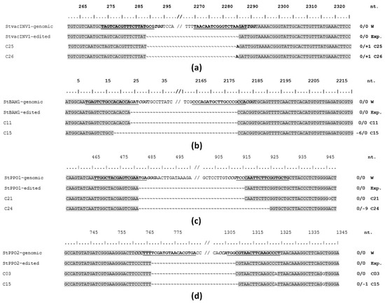 Targeted deletion gene editing characterization by the specific pGEF-X vectors. After infiltration, genomic DNA was extracted from 3–5 explants with the highest GFP and subjected to PCR using the characterization primers. The amplification products were resolved by gel electrophoresis, and the smaller bands, in comparison to each original gene version, were cloned and sequenced. Different DNA repairs at both ends after the CRISPR/Cas9 editing were obtained for the S. tuberosum VACUOLAR INVERTASE 1 (StvacINV1) (a), BETA-AMYLASE 1 (StBAM1) (b), POLYPHENOL OXYDASE 1 (StPPO1) (c) and 2 (StPPO2) (d) genes. Wild type versions of the genes (genomic) are compared with their theoretically edited (Exp) and two experimentally detected (Cx) versions. Guide RNA sequences are in bold underlined font; protospacer adjacent motifs (PAM) are in bold italic font. Homologue nucleotides are boxed in grey. Nucleotide deletions are indicated by the “~” symbol; nucleotide insertions are in bold font. Total insertions/deletions in the amplified fragments are indicated for each Cx case.