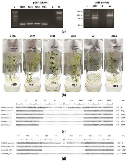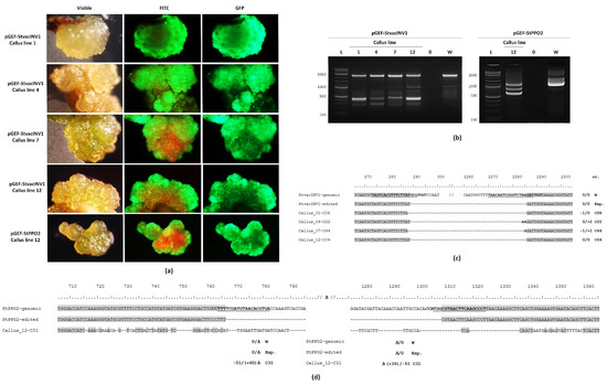 As mentioned, GFP monitoring throughout regeneration showed that most of the explants that initially expressed GFP at 7 dpi tended to decline fluorescence emission when the callusing stage was achieved. Nevertheless, in the case of editors pGEF-StvacINV1 and pGEF-StPPO2 (Table 3), calli with stable GFP emission were observed (9 callus lines, approximately 39 weeks after transformation) (Figure 6a) and analyzed for their editing status. Four out of six callus lines derived from pGEF-StvacINV1 experiments and one out of three callus lines from pGEF-StPPO2 experiments presented shortened bands as the expected targeted deletion edition (Figure 6b); also, alternative editing and repair options, evidencing extensive deletions and/or insertions with different degrees of homology, were seen (Figure 6c,d; Supplementary Figure S6). These transgenic calli represented 12.5% and 5.3% of the total explants kept in PSM400cc medium for pGEF-StvacINV1 and pGEF-StPPO2, respectively. In these callus lines, the transgenic condition was confirmed by PCR detection of both the GFP transgene (Supplementary Figure S5b) and the released and recircularized geminivirus (Supplementary Figure S5c).