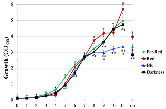 2.1. Effect on the Monochromatic Light on the Growth of E. amylovora In Vitro